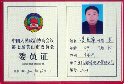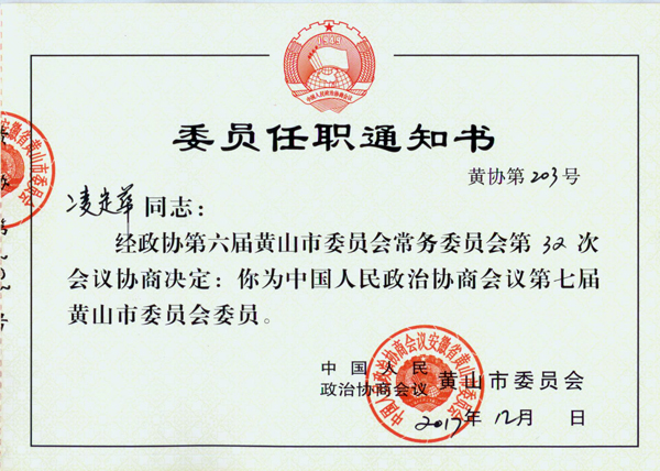中國(guó)人民政治協(xié)商會(huì)議黃山市第七屆委員會(huì)第一次會(huì)議于 2018年1月3日至7日勝利召開(kāi),我公司總經(jīng)理凌定華當(dāng)選黃山市第七屆政協(xié)委員。