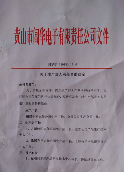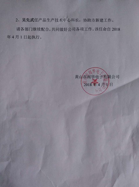 任命吳先武為產品生產技術中心科長,協(xié)助方新建工作。