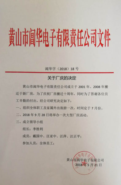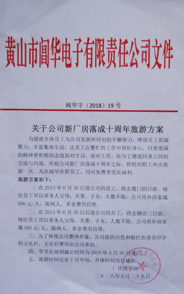為慶祝公司搬遷新廠房10周年,體現(xiàn)公司以人為本的管理理念,讓員工享受企業(yè)發(fā)展帶來的紅利。2018年7月13日至15日公司工會組織第二批5年以下員工及攜家屬70人赴橫店“傾情奉獻(xiàn)在閶華、激情釋放在橫店”三日游活動。