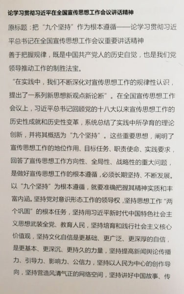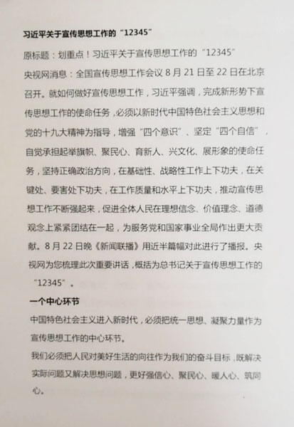 一、學(xué)習(xí)貫徹習(xí)近平總書(shū)記在全國(guó)宣傳思想工作會(huì)議講話精神和習(xí)近平總書(shū)記關(guān)于宣傳思想工作的“12345”。