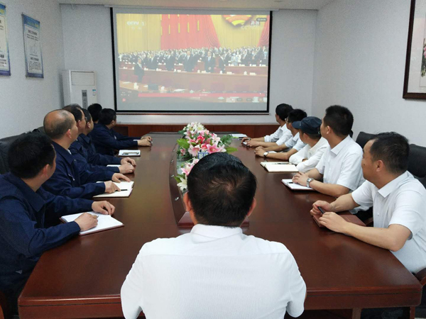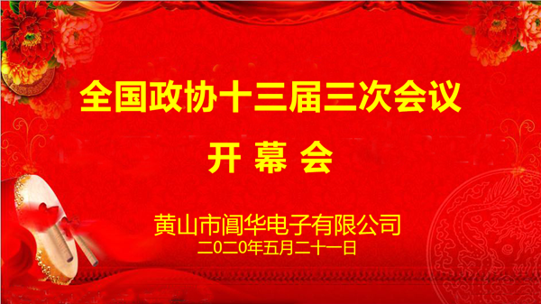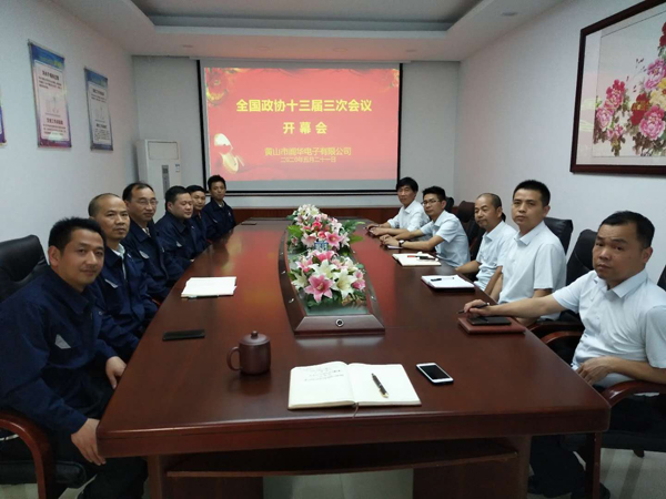 閶華電子公司總經(jīng)理帶領(lǐng)公司中層以上管理人員在二樓會議室,一起收看全國政協(xié)十三屆三次會議開幕會。