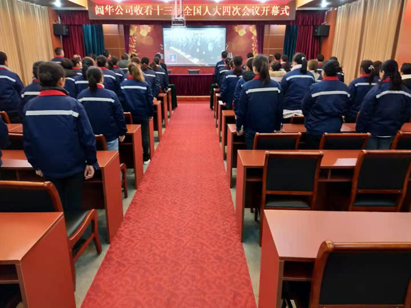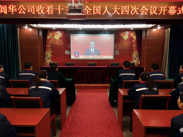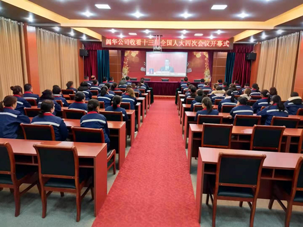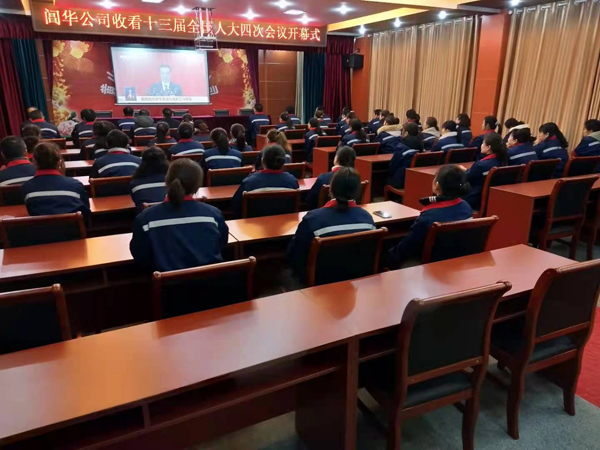 閶華電子公司組織全體職工在二樓綜合會議室,集體觀看第十三屆全國人民代表大會 第四次會議開幕會。