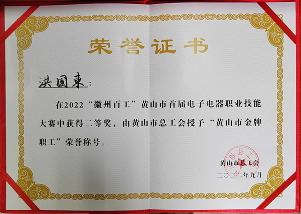 洪國東以優(yōu)異的比賽成績獲二等獎,獲得了由黃山市總工會授予《黃山市金牌職工》榮譽稱號!