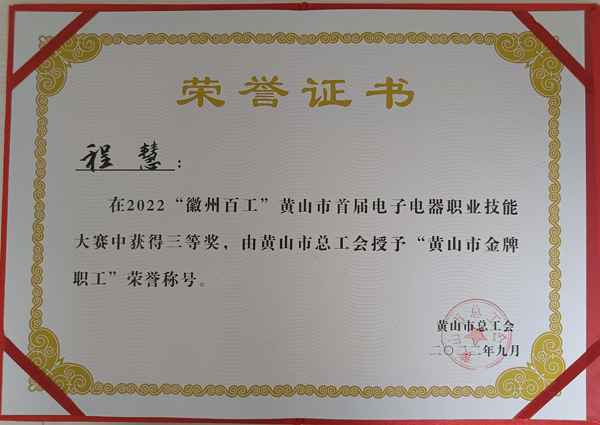 程慧以優(yōu)異的比賽成績獲三等獎,獲得了由黃山市總工會授予《黃山市金牌職工》榮譽稱號!