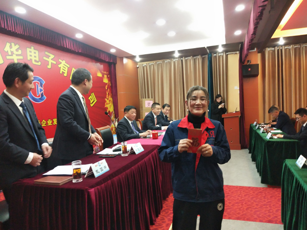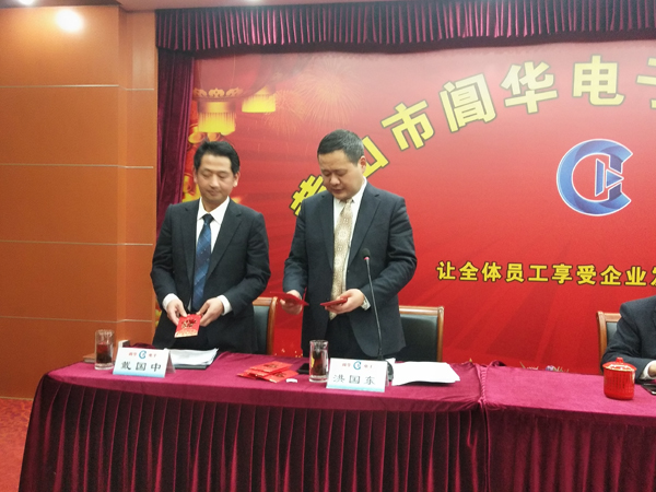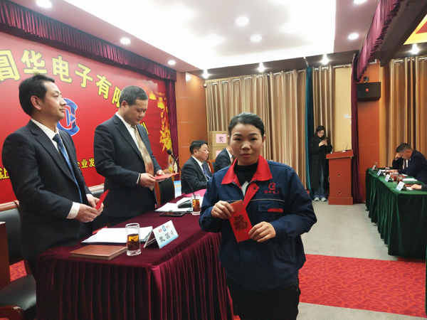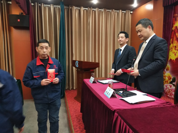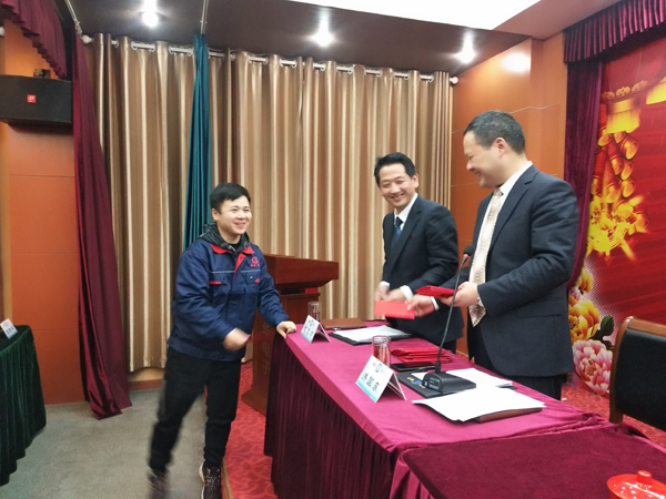 副總經(jīng)理洪國東、戴國中代表公司為員工發(fā)放年終獎(jiǎng)與創(chuàng)新改革獎(jiǎng)紅包