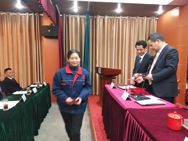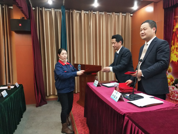 常務(wù)副總汪順利代表公司頒發(fā)電工證、勞動(dòng)關(guān)系協(xié)調(diào)員證書與獎(jiǎng)品