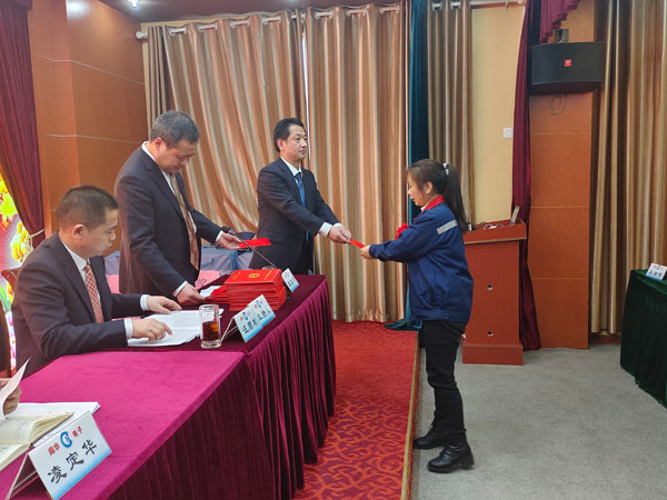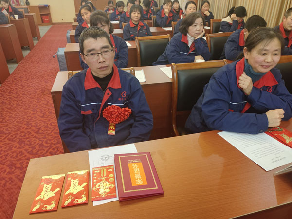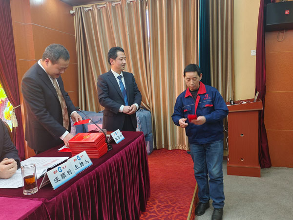 副總經(jīng)理洪國東、戴國中代表公司為員工發(fā)放年終獎與創(chuàng)新改革獎紅包