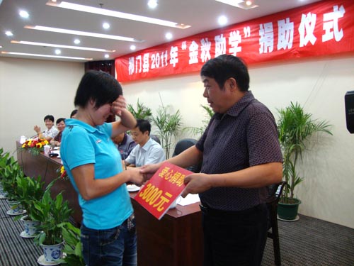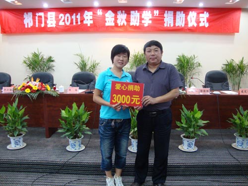 2011年8月25日,祁門縣2011年“金秋助學(xué)”捐助活動(dòng)在縣牯牛隆大酒店舉行,公司總經(jīng)理凌定華參加本次活動(dòng),現(xiàn)場(chǎng)捐助困難大學(xué)生李玉凱3000元學(xué)費(fèi),并承諾今后她大學(xué)期間每年捐助3000元學(xué)費(fèi),共計(jì)12000元。