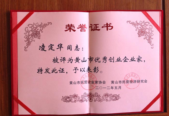 2012年5月被評為黃山市優(yōu)秀創(chuàng)業(yè)企業(yè)家。