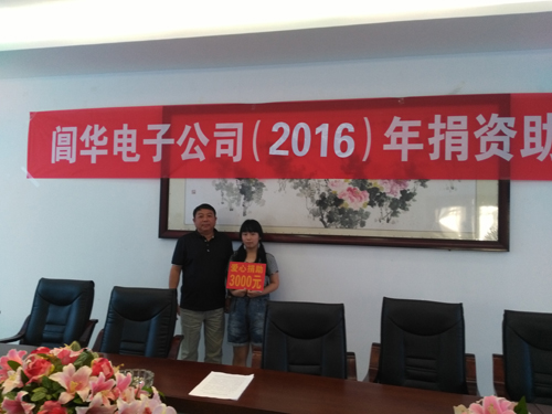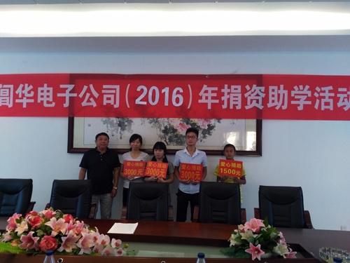 閶華電子公司自2010年開(kāi)展捐資助學(xué)活動(dòng)以來(lái),每年增加一名困難大學(xué)生的助學(xué)捐資,到今年,共捐資了5名大學(xué)生,4名中小學(xué)生,累計(jì)捐款承諾資金近10萬(wàn)元。捐助大學(xué)生中其中有2名已走向工作崗位。為更好地幫助困難學(xué)子完成學(xué)業(yè),今后這項(xiàng)活動(dòng)將每年如期舉行。