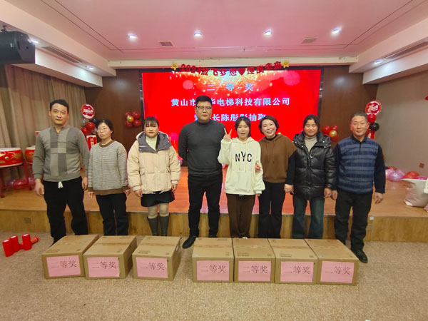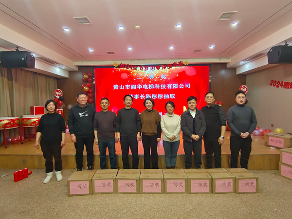 閶華電梯董事長陳彤彤抽取二等獎名單與獲獎員工合影